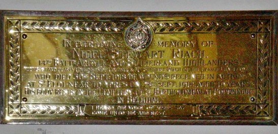 IN EVER LOVING MEMORY OF / NIGEL STEWART RIACH / 14TH BATTALION ARGYLL & SUTHERLAND HIGHLANDERS / YOUNGEST AND DEAREST LOVED SON OF COLONEL AND MRS STEWART RIACH OF THE GRANGE, CHARLCOMBE / WHO DIED 30 SEPTEMBER 1918 OF WOUNDS RECEIVED IN ACTION / AT ST ELOI NEAR YPRES ON 28 SEPTEMBER 1918, AGED 19 YEARS. / HIS BODY RESTS IN THE CEMETERY OF ST BARTHOLOMEW / AT POPERINGHE IN BELGIUM