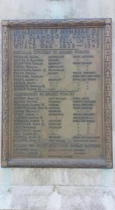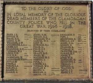 WW1 plaque: TO THE GLORY OF GOD/ AND/ IN LOYAL MEMORY OF THE GLORIOUS/ DEAD. MEMBERS OF THE GLAMORGAN/ COUNTY POLICE, WHO FELL IN THE/ GREAT WAR. 1914 - 1918./ [ERECTED BY THEIR COMRADES]/ (Names) WW2 plaque: IN MEMORY OF MEMBERS OF/ THE GLAMORGAN COUNTY/ POLICE WHO FELL IN THE/ WORLD WAR 1939 - 1945/ REGULAR ARMED FORCES/ (Names)/ AUXILIARIES IN ARMED FORCES/ (Names)/ KILLED ON DUTY THROUGH ENEMY ACTION/ (Names)