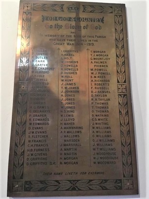 FOR GOD & COUNTRY/ To the Glory of God/ AND/ IN MEMORY OF THE MEN OF THIS PARISH/ WHO GAVE THEIR LIVES IN THE/ GREAT WAR 1914 - 1919./ (Names)/ "THEIR NAME LIVETH FOR EVERMORE"