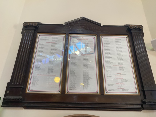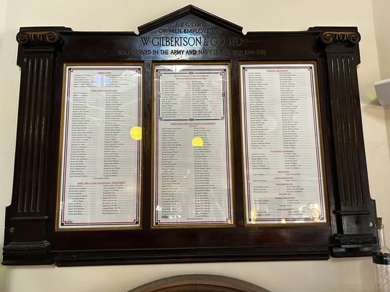 OFFICE STAFF/ (Names)/ STEEL WORKS DEPT./ (Names)/ SHEET MILLS AND GALVANIZING DEPT./ (Names)/ SLAG DEPT./ (Names)/ TINPLATE DEPT./ (Names)/ ENGINEERS DEPT./ (Names)/ BRICKLAYERS/ (Names)/ TRAFFIC DEPT./ (Names)/ CRANE DRIVERS ETC./ (Names)/ GENERAL DEPT./ (Names)/ [?THE FOLLOWING W GILBERTSON AND COMPANY EMPLOYEES MADE THE SUPREME SACRIFICE IN THE GREAT WAR 1914-1918?]/ (Names) (Exact wording unknown)