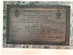 TO THE GLORY OF GOD/ AND/ IN HONOURED MEMORY OF/ LEWIS WILSON/ CAPTAIN 9TH ESSEX REGIMENT/ DIED ON ACTIVE SERVICE NOV 27th 1916 AGED 32 YEARS/ ALSO OF/ CLEMENT WILSON/ LIEUT 1st WORCESTERSHIRE REGIMENT/ KILLED AT THE BATTLE OF LOOS SEPT 25th 1915/ AGED 27 YEARS/ "DULCE ET DECORUM EST PRO PATRIA MORI"/ THIS TABLET IS ERECTED BY THEIR SISTER