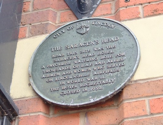 CITY OF LINCOLN/ THE SARACEN'S HEAD/ NEAR THIS SITE WAS THE/ SARACEN'S HEAD HOTEL/ A FAVOURITE WATERING HOLE FOR THOUSANDS OF/ RAF AND ALLIED AIRMEN AND WOMEN/ WHO SERVED ON LINCOLNSHIRE AIRFIELDS/ IN WORLD WAR 11./ THE HOTEL REGRETTABLY CLOSED DOWN IN 1959