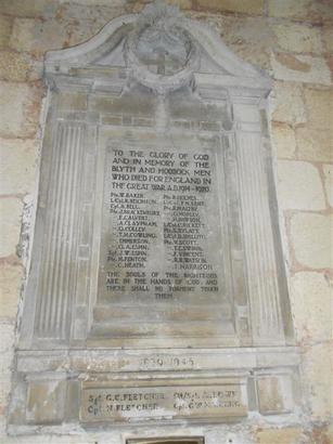 TO THE GLORY OF GOD/ AND IN MEMORY OF THE/ BLYTHE AND HODSOCK MEN/ WHO DIED FOR ENGLAND IN/ THE GREAT WAR. A.D. 1914 - 1920/ (NAMES)/ THE SOULS OF THE RIGHTEOUS/ ARE IN THE HANDS OF GOD. AND/ THERE SHALL NO TORMENT TOUCH/ THEM./ 1939 - 1945/ (NAMES)