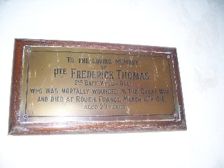 To the loving memory of Pte Frederick Thomas/2nd Battalion Welsh regiment/who was mortally wounded in the Great War/and died at Rouen France March 10th 1916 aged 20.
