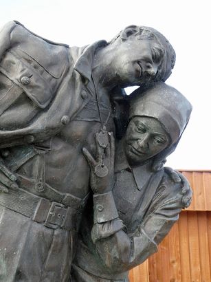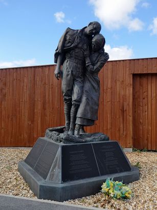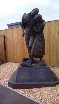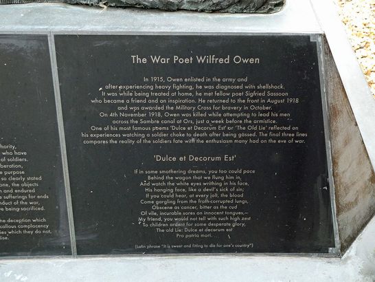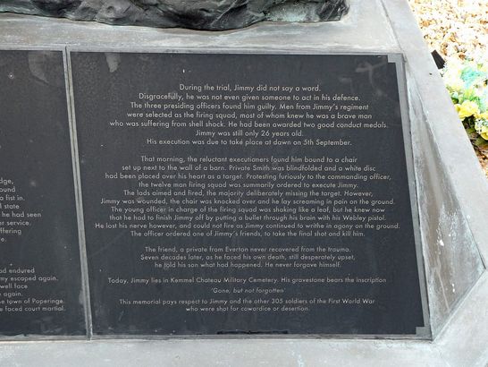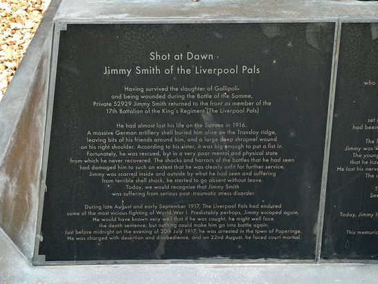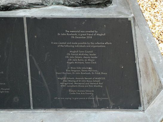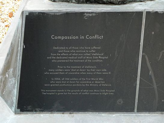 Side 1-The War Poet Wilfrid Owen/In 1915, Owen enlisted in the army and/after experiencing heavy fighting, he was diagnosed with shell shock./It was while being treated at home, he met fellow poet Siegfried Sassoon/who became a friend and an inspiration. He returned to the front in August 1918/and was awarded the Military Cross for bravery in October./On 4th November 1918, Owen was killed while attempting to lead his men/across the Sambre canal at Ors, just a week before the armistice. One of his most famous poems 'Dulce et Decorum Est' or 'The Old Lie' reflected on/his experiences watching a soldier choke to death after being gassed. The final three lines/compares the reality of the soldiers fate with the enthusiasm many had on the eve of war./'Dulce et Decorum Est'/If in some smothering dreams, you too could pace/Behind the wagon that we flung him in,/And watch the white eyes wreathing in his face,/His hanging face, like a devil's sick of sin,/If you could hear, at every jolt, the blood/Come gargling from the froth-corrupted lungs,/Obscene as cancer, bitter as the curd/Of vile, incurable sores on innocent tongues-/My friend, you would not tell with such high cost/To children ardent for some desperate glory,/The old Lie: Dulce et decorum est/Pro patria mori /[Latin phrase '"It is sweet and fitting to die for one's country"] Side 2-The War Poet Siegfried Sassoon/Sassoon enlisted in 1914 drawn by the patriotic mood of the time/but after suffering the horrors of the trenches and the front line/he made this statement, culminating in his admission/to a military psychiatric hospital for treatment for shell shock/A Soldier's Declaration (1917)/I am making this statement as an act of wilful defiance of military authority,/because I believe that the War is being deliberately prolonged by those who have/the power to end it. I am a soldier, convinced that I am acting on behalf of all soldiers./I believe that this War, on which I entered as a war of defence and liberation, has now become a war of aggression and conquest. I believe that the purpose/for which I and my fellow soldiers entered upon the war should have been so clearly stated/as to have made it impossible to change them, and that had this been done, the objects, which actuated us would now be attainable by negotiation. I have seen and endured/the sufferings of the troops, and I can no longer be a party to prolong these sufferings for ends/which I believe to be evil and unjust. I am not protesting against the conduct of the war,/but against political errors and inaccuracies for which the fighting men are being sacrificed/On behalf of all those who are suffering I make this protest against the description which/is being practiced on them, also I believe that I may help to destroy the callous complacency/with which the majority of those at home regard the contrivance of agonies, which they do not,/and which they have not sufficient imagination to realise. Side 3-The memorial was unveiled by/Dr John Rowlands, a great friend of Maghull/7th December 2018/It was created and made possible by the collective efforts/of the following individuals and organisations/Maghull Town Council/Cllr Patrick McKinley, leader/Cllr John Sayers, deputy leader/Cllr June Burns, ex Mayor/Angela McIntyre, Town Clerk/Moss Side volunteers/Ross Ferguson, Emma Harrison/Stuart Harrison, Dr John Rowlands, Dr Frank Sharp/Maghull Schools, Amanda Bennett of MADCOS/Alex Waring of St John Bosco School/Merseytravel, Merseyrail and Network Rail/WW1 consultants Diane and Rob Wantling/Sculptor Andrew Edwards/Castle Fine Arts Foundry/All we are saying "is give peace a chance", John Lennon Side 4-Compassion in Conflict/Dedicated to all those who have suffered/and those who continue to suffer/from the effects of what was called 'shellshock'/and the dedicated medical staff of Moss Side Hospital/who pioneered the treatment of the condition//Prior to the treatment of shellshock,/many soldiers were 'shot at dawn' by their own side,/who accused them of cowardice when many of them were ill/In 2006, all 306 soldiers of the First World War/who were shot at dawn for cowardice or desertion/were granted posthumous pardons by the Ministry of Defence/This memorial stands in the grounds of what was Moss Side Hospital./The hospital is gone but the results of conflict continue to blight lives Side 5-Shot at Dawm/Jimmy Smith of the Liverpool Pals/Having survived the slaughter of Gallopoli/and being wounded during the Battle of the Somme,/Private 52929 Jimmy Smith returned to the front as member of the/17th Battalion of the King's Regiment (The Liverpool Pals)//He had almost lost his life on the Somme in 1916./A massive German artillery shell buried him alive on the Transloy ridge,/leaving bits of his friends around him, and a large deep shrapnel wound/on his right shoulder. According to his sister, it was big enough to put a fist in./Fortunately, he was rescued, but in a very poor mental and physical state/from which he never recovered. The shocks and horrors of the battles that he had seen/had damaged him to such an extent that he was clearly unfit foe further service./Jimmy was scared inside and outside by what he had seen and suffering/from terrible shell shock, he started to go absent without leave./Today we would recognise that Jimmy Smith/was suffering from serious post-traumatic stress disorder.//During late August and early September 1917, The Liverpool Pals had endured/some of the most vicious fighting of World War 1. Predictably perhaps, Jimmy escaped again./He would have known very well, that if he was caught, he might well face/the death sentence, but nothing could make him go into battle again./Just before midnight on the evening of 30th July 1917, he was arrested in the town of Poperinge./He was charged with desertion and disobedience, and on 22nd August, he faced court martial. Side 6-During the trial, Jimmy did not say a word./Disgracefully, he was not even given someone to act in his 