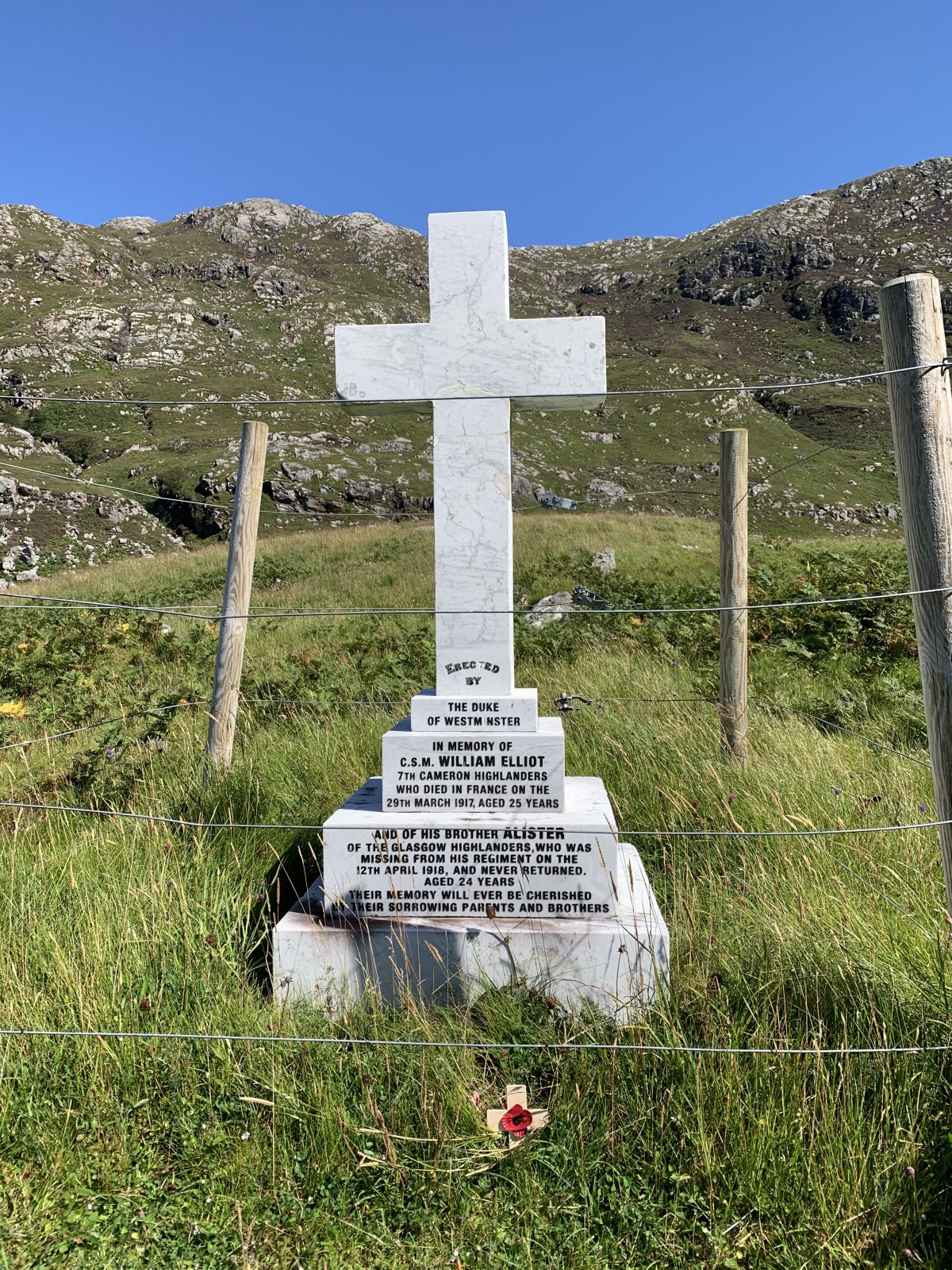 ERECTED BY/ THE DUKE OF WESTMINSTER/ IN MEMORY OF/ C.S.M. WILLIAM ELLIOT/ 7TH CAMERON HIGHLANDERS/ WHO DIED IN FRANCE, ON THE 29TH, MARCH 1917, AGED 25 YEARS/ AND OF HIS BROTHER ALISTAIR/ OF THE GLASGOW HIGHLANDERS, WHO WAS/ MISSING FROM HIS REGIMENT ON THE/ 12TH APRIL. 1918, AND NEVER RETURNED/ AGED 24 YEARS/ THEIR MEMORY WILL EVER BE CHERISHED/ BY THEIR SORROWING PARENTS AND BROTHERS/