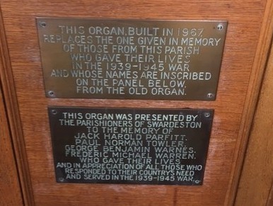 Plaque 1: THIS ORGAN, BUILT IN 1967,/ REPLACES THE ONE GIVEN IN MEMORY/ OF THOSE FROM THIS PARISH/ WHO GAVE THEIR LIVES/ IN THE 1939-1945 WAR/ AND WHO NAMES ARE INSCRIBED/ ON THE PANEL BELOW,/ FROM THE OLD ORGAN./ Plaque 2: THIS ORGAN WAS PRESENTED BY/ THE PARISHIONERS OF SWARDSTON/ TO THE MEMORY OF/ (Names)/ WHO GAVE THEIR LIVES/ AND IN APPRECIATION OF ALL THOSE WHO/ RESPONDED TO THEIR COUNTRY'S NEED/ AND SERVED IN THE 1939-1945 WAR.