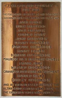+ FOR GOD AND COUNTRY+/1914-1918/THE FOLLOWING MEMBERS OF THE CATECHISM/LAID DOWN THEIR LIVES DURING THE GREAT WAR/[names]/AND IN THEIR BLESSED MEMORY THE/ALTAR CANDLESTICKS WERE GIVEN TO/THE CHURCH BY THOSE WHO LOVED THEM