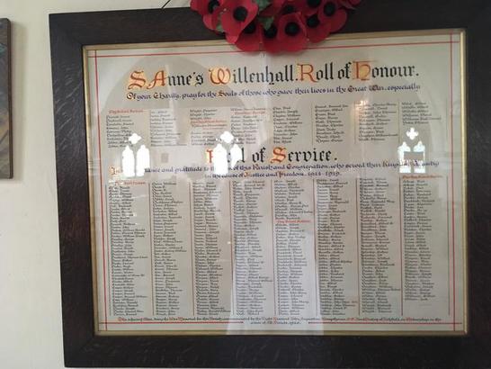 S. Anne's Willenhall, Roll of Honour./Of your Charity, pray for the Souls of those who gave their lives in the Great War, especially/[names in 7 columns]/Roll of Service/In …/and gratitude to the men of this Parish and Congregation, who served their King and Country/in the cause of Justice and Freedom. 1914-1919/[names in 8 columns]/The adjacent Altar, being the War Memorial for the Parish, was consecrated by the Right Reverend John Augustine Kempthorne, B.D. Lord Bishop of Lichfield, on Wednesday in the/octave of All Saints, 1920.