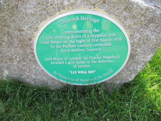 THURROCK HERITAGE/ Commemorating the/ first shooting down of a zeppelin over/ Great Britain on the night of 31st March 1916,/ by the Purfleet Garrison controlled,/ Royal Artillery Gunners./ Lord Mayor of London. Sir Charles Wakefield,/ awarded a gold medal to the defenders/ of London./ "L15 WELL HIT"/ By Thames to all Peoples of the World