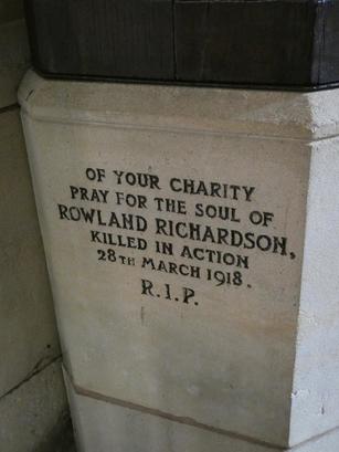 OF YOUR CHARITY/ PRAY FOR THE SOUL OF,/ ROWLAND RICHARDSON,/ KILLED IN ACTION/ 28TH MARCH 1918./ R.I.P.