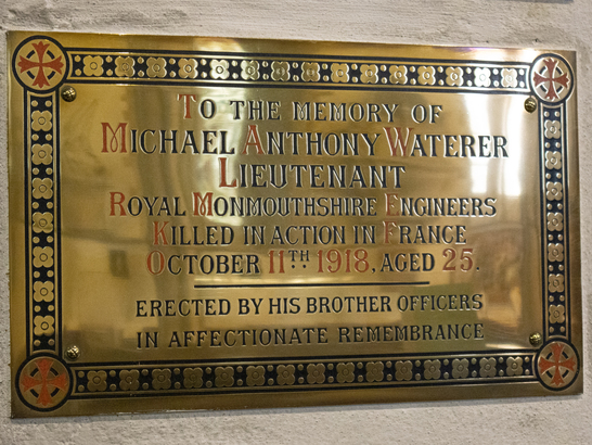 TO THE MEMORY OF/MICHAEL ANTHONY WATERER/LIEUTENANT/ROYAL MONMOUTHSHIRE ENGINEERS/KILLED IN ACTION IN FRANCE/OCTOBER 11TH 1918, AGED 25./___/ERECTED BY HIS BROTHER OFFICERS/IN AFFECTIONATE REMEMBRANCE