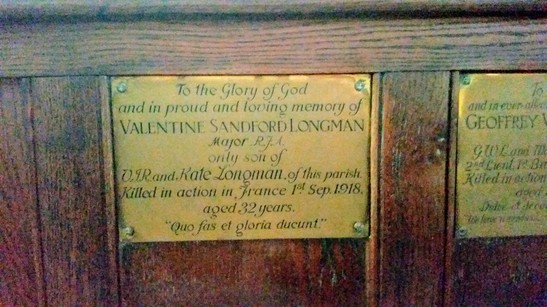 To the Glory of God and in proud and loving memory of Valentine Sandford Longford Major R.F.A. only son of V.J.R. and Kate Longman of this parish Killed in Action in France 1st Sep 1918 aged 32 years "quo fas et Gloria ducunt"