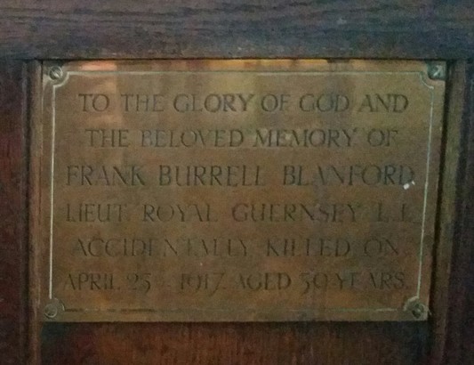 To the Glory of God and Beloved Memory of Lieut Frank Burrell Blandford Royal Guernsey L.I. Accidently Killed on April 25th1917 Aged 59 Years