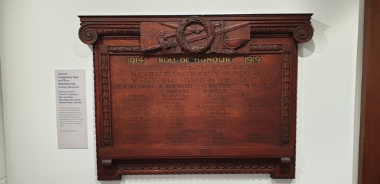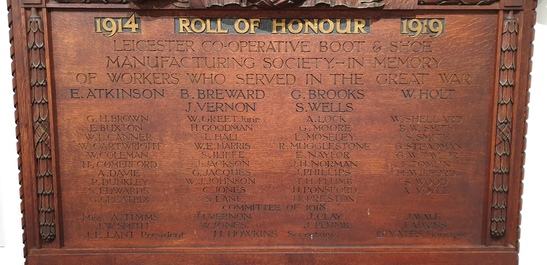 1914 ROLL OF HONOUR 1919 LEICESTER CO-OPERATIVE BOOT & SHOE / MANUFACTURING SOCIETY - IN MEMORY / OF WORKERS WHO SERVED IN THE GREAT WAR