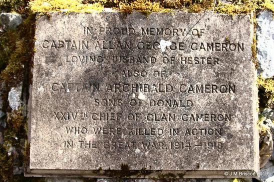 IN PROUD MEMORY OF / CAPTAIN ALLAN GEORGE CAMERON / LOVING HUSBAND OF HESTER / ALSO OF / CAPTAIN ARCHIBALD CAMERON / SONS OF DONALD / XXIVTH CHIEF OF CLAN CAMERON / WHO WERE KILLED IN ACTION / IN THE GREAT WAR, 1914 - 1918