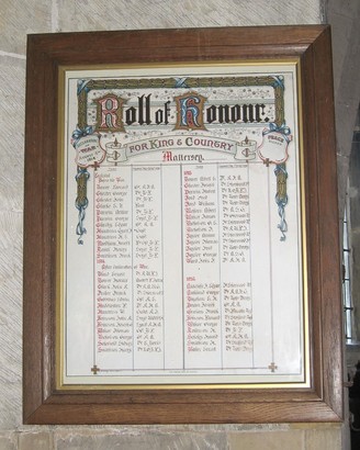 Roll of Honour/FOR KING & COUNTRY/Mattersey [In a shield at the left hand side] DECLARATION OF WAR/AUGUST 4TH/1914 [In a shield at the right hand side] PEACE/SIGNED/[date left blank] [Column 1]-Served/Before the War/[12 names]/1914/After declaration of War/[13 names] [Column 2]- 1915/[14 names]/1916/[11 names]