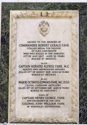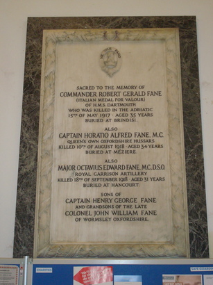SACRED TO THE MEMORY OF/COMMANDER ROBER GERALD FANE/(ITALIAN MEDAL FOR VALOUR)/OF H.M.S. DARTMOUTH/WHO WAS KILLED IN THE ADRIATIC/15TH OF MAY 1917-AGED 35 YEARS/BURIED AT BRINDISI//ALSO/CAPTAIN HORATIO ALFRED FANE, M.C./QUEEN'S OWN OXFORDSHIRE HUSSARS/KILLED 10TH OF AUGUST 1918-AGED 34 YEARS/BURIED AT MEZIERE//ALSO/MAJOR OCTAVIUS EDWARD FANE, M.C., D.S.O./ROYAL GARRISON ARTILLERY/KILLED 18TH OF SEPTEMBER 1918-AGED 31 YEARS/BURIED AT HANCOURT//SONS OF/CAPTAIN HENRY GEORGE FANE/AND GRANDSONS OF THE LATE/COLONEL JOHN WILLIAM FANE/OF WORMSLEY OXFORDSHIRE