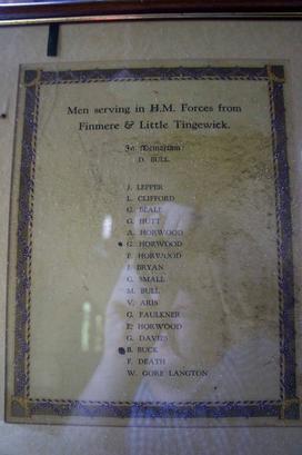 Men serving in H.M. Forces from/Finmere & Little Tingewick/In Memoriam/[name]/[names of the served, 2 of whom have black spots next to them which may mean that they are also casualties]