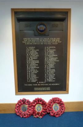 /SONS OF THIS SCHOOL LET THIS OF YOU BE SAID/THAT YOU WHO LIVE ARE WORTHY OF YOUR DEAD/THESE GAVE THEIR LIVES THAT YOU WHO LIVE MAY REAP/A RICHER HARVEST ERE YOU FALL ASLEEP/(names)/"AND SOME THERE BE WHO HAVE NO MEMORIAL."/ERECTED BY PAST AND PRESENT MEMBERS/OF REIGATE GRAMMAR SCHOOL IN MEMORY OF/THE OLD BOYS WHO MADE THE SUPREME/SACRIFICE FOR KING & COUNTRY 1914-1919/