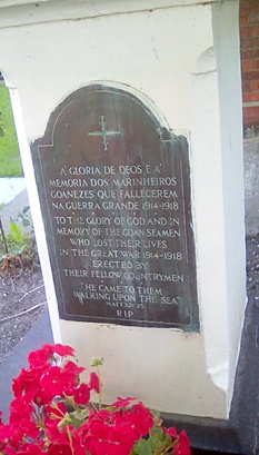 +/A GLORIA DE DEOS E.A./MEMORIA DOS MARINHEIROS/GOANEZES QUE FALLECEREM/NA GUERRA GRANDE 1914-1918/TO THE GLORY OF GOD AND IN/MEMORY OF THE GOAN SEAMEN/WHO LOST THEIR LIVES/IN THE GREAT WAR 1914-1918/ERECTED BY/THEIR FELLOW COUNTRYMEN/"HE CAME TO THEM/WALKING UPON THE SEA"/MATT. XIV. 25/R.I.P.