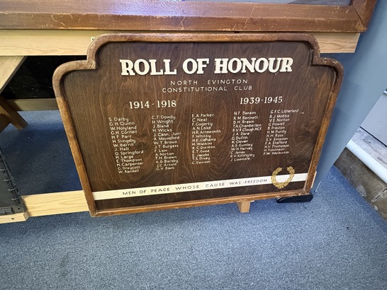 ROLL OF HONOUR / NORTH EVINGTON CONSTITUTIONAL CLUB / 1914 - 1918 / 1939 - 1945 / NAMES / MEN OF PEACE WHOSE CAUSE WAS FREEDOM