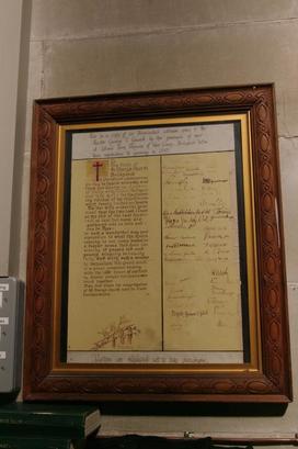 This is a copy of an illuminated address given to the/Rector George T. Gravell by the prisoners of war/at Island Farm Prisoners of War Camp, Bridgend before/their repatriation to Germany in 1947. [Left Hand Panel]- To/The Choir of/St Mary's Church/Bridgend/In Christian Communion/we beg to thank sincerely and/from our hearts the Rector/of Coity with Nolton, Bridgend/and his choir for the elevat/ing recital of the Crucifixion/which deeply touched our hearts/We feel with a special grat/itude that the two last lines/at the end of the last hymn/-till at last her sons are/gathered one in love and/one in Thee./in such a wonderful way gave/expression to what the choirs/coming to our camp mention/a deeper sense, this choir con/sisting of people old and/young singing so beauty/fully and with such a wonder/ful enthusiasm this grand work/of a great composer dealing/with the last hours of our Lord/by whose prayer our hearts were/bound together./May God bless the congregation/of St Mary's Church and its choir/furthermore. [Right Hand Panel]- [signatures of the Prisoners of War] [Across the base]-Easter 1947/Visitors are requested not to take photograph [sic]