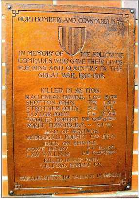 NORTHUMBERLAND CONSTABULARY/ IN MEMORY OF THE FOLLOWING/ COMRADES WHO GAVE THEIR LIVES/ FOR KING AND COUNTRY IN THE/ GREAT WAR 1914-18/KILLED IN ACTION/ (6 names)/ DIED OF WOUNDS/ (1 name)/ DIED ON SERVICE (2 names)/ KILLED IN AIR RAID/ (1 name)/ STEADFAST IN LIFE, VALIANT IN DEATH