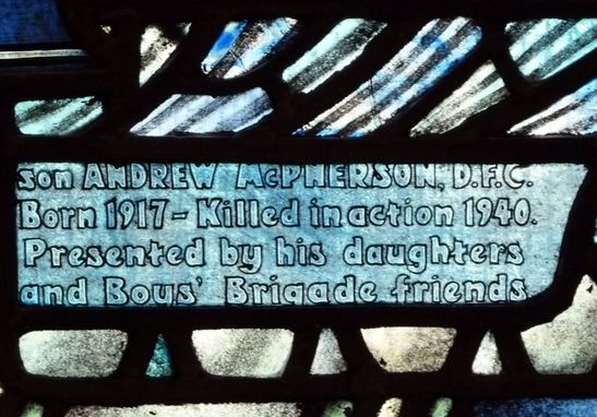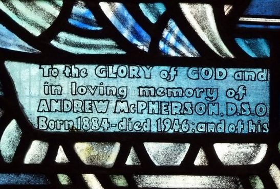 Left Light-To the GLORY of GOD and/in loving memory of/ANDREW MCPHERSON, D.S.O./Born 1884-died 1946 and of his Right Light-son ANDREW MCPHERSON, D.F.C./Born 1917-Killed in action 1940./Presented by his daughters/and Boys' Brigade friends