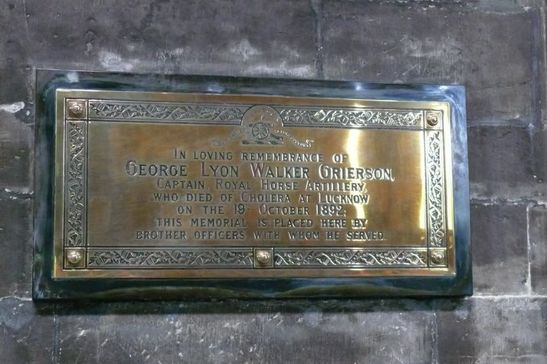 IN LOVING REMEMBRANCE OF/GEORGE LYON WALKER GRIERSON/CAPTAIN ROYAL HORSE ARTILLERY/WHO DIED OF CHOLERA AT LUCKNOW/ON THE 19TH OCTOBER 1892/THIS MEMORIAL IS PLACED HERE BY/BROTHER OFFICERS WITH WHOM HE SERVED