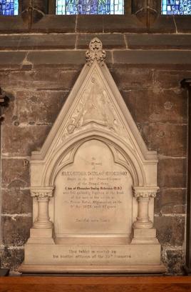 To the memory of ALEXANDER DUNLOP ANDERSON /Major in the 23rd (Pioneer) Regiment of the Bengal Army /(Son of Alexander Dunlop Anderson M.D.) /Who fell gallantly fighting at the head /of his men in the action at /Peiwar Kotal, Afghanistan on the /2nd December 1878 aged 37 years. /"Faithful unto Death" //This tablet is erected by his brother officers of the 23rd Pioneers.