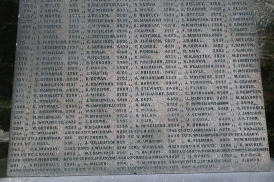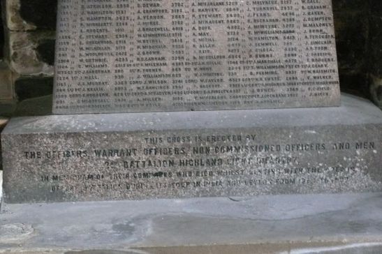 [names in 5 columns]/This cross is erected by/the officers, warrant officers, non commissioned officers and men/of 2nd Battalion Highland Light Infantry. / In memoriam of their comrades who died whilst serving with the colours /of the Battalion during its tour of India and Ceylon ???? to ????