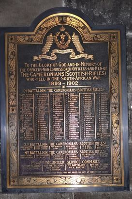 THE CAMERONIANS/SCOTTISH RIFLES/TO THE GLORY OF GOD AND IN MEMORY OF/THE OFFICERS, NON COMMISSIONED OFFICERS AND MEN OF/THE CAMERONIANS (SCOTTISH RIFLES)/WHO FELL IN THE SOUTH AFRICAN WAR/1899-1902/2ND BATTALION THE CAMERONIANS (SCOTTISH RIFLES)/[149 names in 6 columns]/3RD BATTALION THE CAMERONIANS (SCOTTISH RIFLES)/[12 names in 6 columns]/4TH BATTALION THE CAMERONIANS (SCOTTISH RIFLES)/[14 names in 6 columns]/1ST AND 2ND VOLUNTEER SERVICE COMPANIES/[column 1]- 5TH BATTALION/[name]/[column 2]- 6TH BATTALION/[2 names]/[column 3]- 7TH BATTALION/[name]/[column 4]- 8TH BATTALION/[2 names]