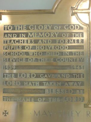 TO THE GLORY OF GOD/AND IN MEMORY OF THE/TEACHERS AND FORMER/PUPILS OF HOLYROOD/SCHOOL WHO DIED IN THE/SERVICE OF THEIR COUNTRY/1939 1945/THE LORD GAVE AND THE/LORD HATH TAKEN AWAY/BLESSED BE/THE NAME OF THE LORD Across the Base-MAY THEY REST IN PEACE