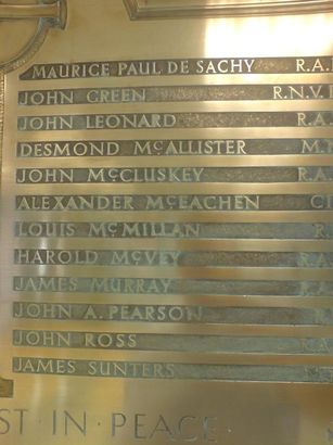 MAURICE PAUL DE SACHY RAF/ JOHN GREEN RNVR/ JOHN LEONARD RAF/ DESMOND McALLISTER MN/ JOHN McCLUSKEY RAF/ ALEXANDER McEACHEN CIV[ilian]/ LOUIS MCMILLAN RNVR/ HAROLD MCVEY RAF/ JAMES MURRAY RAF/ JOHN A PEARSON RN/ JOHN ROSS RAF/ JAMES SUNTERS MN/