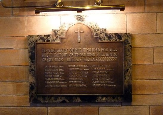 TO THE GLORY OF HIM WHO DIED FOR ALL /AND IN MEMORY OF THOSE WHO FELL IN THE /GREAT WAR MCMXIV – MCMXIX/[names in 3 columns]