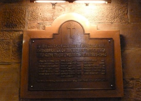 +/TO THE GLORY OF GOD AND IN AFFECTIONATE /REMEMBRANCE OF THE MEN OF THIS CHURCH /WHO GAVE THEIR LIVES IN THE GREAT WAR 1939 – 1945/[names in 3 columns]/“BE THEE FAITHFUL UNTO DEATH AND I WILL GIVE YOU A CROWN OF LIFE”