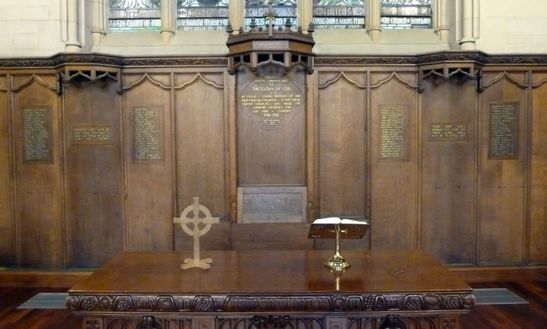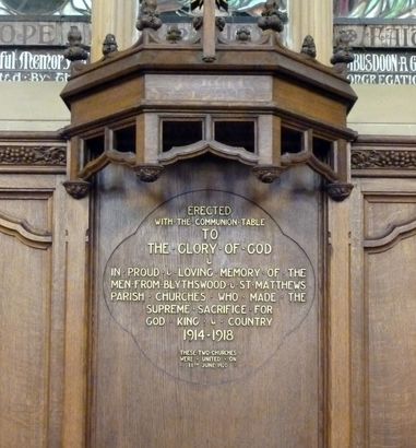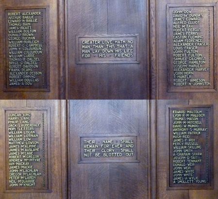 Central Panel-ERECTED/WITH THE COMMUNIION TABLE/TO /THE GLORY OF GOD/&/IN PROUD & LOVING MEMORY OF THE/ MEN FROM BLYTHSWOOD & ST. MATTHEW’S/ PARISH CHURCHES WHO MADE THE/ SUPREME SACRIFICE FOR/ GOD, KING & COUNTRY/1914 ~ 1918/THESE TWO CHURCHES/WERE UNITED ON/11TH JUNE 1920/ Far left names panel-[names A to James Dow] Left Valediction Panel-GREATER LOVE HATH NO/ MAN THAN THIS THAT A /MAN MAY LAY DOWN HIS LIFE/ FOR HIS FRIENDS Near Left names panel-[names John Dow to Johnston] Near Right names Panel-THEIR NAME SHALL/REMAIN FOR EVER AND/THEIR GLORY SHALL/NOT BE BLOTTED OUT Right Valediction panel-[names King to McKnight] Far right names panel-[names Malcolm to Young]
