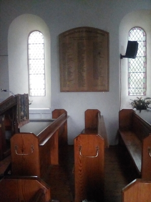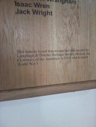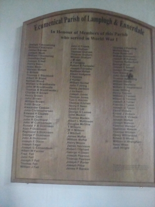 Ecumenical Parish of Lamplugh & Ennerdale/In Honour of Members of this Parish/who served in World War I/[names in 3 columns]/This honour board was researched and erected by/Lamplugh & District Heritage Society to mark the/Centenary of the Armistice in 1918 which ended/World War I