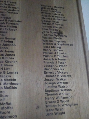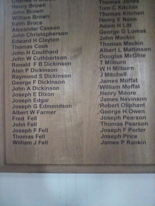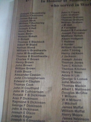 Column 1- Joseph T Armstrong/ William F Atkinson/ James Barnes/ Joseph Beck/ William T Beckerieg/ Jonathan Bell/ Joseph S Bell/ Henry Benn/ Isaac Benn/ Watson Birkett/ G Birkett/ Thomas E Blacklock/ Albert W Bland/ Nathan Bland/ William U Branthwaite/ John W Branthwaite/ Thomas B Branthwaite/ Charles H Brown/ Henry Brown/ John Brown/ William Brown/ Edith Bruce/ Alexander Casson/ John Christopherson/ Edward H Clayton/ Thomas Cook/ John H Coulthard/ John W Cuthbertson/ Ronald F B Dickinson/ Alan P Dickinson/ Raymond S Dickinson/ George F Dickinson/ John A Dickinson/ Joseph E Dixon/ Joseph Edgar/ Joseph G Edmondson/ Albert W Farmer/ Fred Fell/ John Fell/ Joseph F Fell/ Thomas Fell/ William J Fell; Column 2- John H Frears/ John Graham/ Thomas Graham/ Thomas Graham/ William Graham/ J M Hall/ A Forrester/ Robert B Forrester/ Joseph Forrester/ Matthew Hellon/ Albert Hodgson/ T Holmes/ J Hunter/ William Hunter/ John T Irving/ Henry Jackson/ J Jackson/ Joseph Jones/ Thomas Jones/ Tom C Kitchin/ Thomas Kitchen/ Henry E Neen/ Adam H Litt/ George G Lomas/ John Mackin/ Thomas Mackin/ Albert L Mattinson/ Douglas McGhie/ T Milburn/ W H Milburn/ J Mitchell/ James Moffat/ William Moffat/ Henry Moore/ James Nevinson/ Robert Oliphant/ George H Owen/ Joseph Pearson/ Thomas Pearson/ Joseph F Porter/ Joseph Price/ James P Rankin; Column 3- Thomas J Rawling/ William Reay/ Peter Robinson/ William Robinson/ Joseph W Robson/ Thomas Rutherford/ George Scurr/ Joseph E Sewell/ Joseph Sharpe/ Tom Sisson/ John Spedding/ Thomas Spedding/ William Steele/ William Stephens/ William G Stephenson/ Isaac Stilling/ Henry Tinnion/ William J Tinnion/ Wilson G Tinnion/ Joseph A Turner/ Francis J Tyson/ Joseph G Tyson/ David Vickers/ Ernest J Vickers/ Thomas K Vickers/ Joseph Walker/ Joseph Watson/ Fletcher Watson/ Septimus Watson/ Thomas Whitten/ Henry Williamson/ Ernest G Wood/ William H Wrangham/ Isaac Wren/ Jack Wright