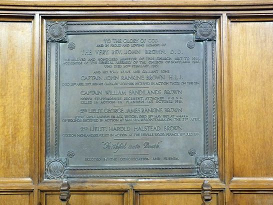 TO THE GLORY OF GOD AND IN PROUD AND LOVING MEMORY OF/ THE VERY REV. JOHN BROWN D.D./ THE BELOVED AND HONOURED MINISTER OF THIS CHURCH 1887 TO 1918/ MODERATOR OF THE GENERAL ASSEMBLY OF THE CHURCH OF SCOTLAND/ 1915,/WHO DIED 20TH FEBRUARY 1919// AND HIS FOUR BRAVE AND GALLANT SONS/ CAPTAIN JOHN RANKINE BROWN H.L.I./ DIED 23RD APRIL 1917 BEFORE GAZA, OF WOUNDS RECEIVED IN ACTION THERE ON THE 21ST// CAPTAIN WILLIAM SANDILANDS BROWN/ NORTH STAFFORDSHIRE REGIMENT ATTACHED K.O.S.B./ KILLED IN ACTION IN FLANDERS 14TH OCTOBER 1918// 2ND LIEUT. GEORGE JAMES RANKINE BROWN/ ROYAL HIGHLANDERS (BLACK WATCH), DIED 21ST MAY 1917 AT AMARA,/ OF WOUNDS RECEIVED IN ACTION AT SAMARA, MESOPOTAMIA, ON THE 21ST APRIL.// 2ND LIEUT. HAROLD HALSTEAD BROWN/ GORDON HIGHLANDERS, KILLED IN ACTION AT THE DELVILLE WOOD, FRANCE, 18TH JULY 1916.// “Faithful unto Death”// ERECTED BY THE CONGREGATION AND FRIENDS.