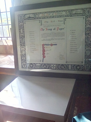 Top: THE ROLL OF HONOUR/The Hill School Centre- THIS DOCUMENT IS A TRANSLATION AND FACSIMILE OF THE SIGNATURES FROM THE ORIGINAL TREATY OF 1831/ GUARANTEEING THE INDEPENDENCE AND NEUTRALITY OF BELGIUM, WHICH WAS CONFIRMED BY THE SIX/ POWERS IN THE FAMOUS TREATY OF 1839, THE BREAKING OF WHICH BY GERMANY IS RESPONSIBLE FOR THE/ PRESENT WAR WITH THE BRITISH EMPIRE/ THE "SCRAP OF PAPER"/ ARTICLE II/ HER MAJESTY THE QUEEN OF THE UNITED KINGDOM OF GREAT BRITAIN AND IRELAND/ HIS MAJESTY THE EMPEROR OF AUSTRIA, KING OF HUNGARY AND BOHEMIA, HIS MAJESTY / THE KING OF THE FRENCH, HIS MAJESTY THE KING OF PRUSSIA, AND HIS MAJESTY THE EMPEROR OF ALL THE RUSSIAS, DECLARE, THAT THE ARTICLES MENTIONED IN THE PRECEEDING ARTICLE, ARE CONSIDERED AS HAVING THE SAME FORCE AND VALIDITY AS IF THEY WERE TEXTUALLY INSERTED IN THE PRESENT ACT, AND THAT THEY ARE THUS PLACED WITH THE GUARENTEE/ OF THE SAID MAJESTIES/ ARTICLE VII/ BELGIUM, WITHIN THE LIMITS SPECIFIED IN ARTICLES I, II AND IV, SHALL FORM AN INDEPENDENT AND PERPETUALLY NEUTRAL STATE. IT SHALL BE BOUND TO OBSERVE SUCH NEUTRALITY TOWARDS ALL OTHER STATES. (SIGNED AND SEALED BY) PALMERSTON BRITISH PLENIPOTENTIARY/ SYLVAN VAN DE WEYER BELGIAN PLENIPOTENTIARY/ SENFTT AUSTRIAN PLENOPOTENTIARY/ H. SEBASTIANI FRENCH PLENIPOTENTIARY/ BULOW PRUSSIAN PLENIPOTENTIARY/ POZZI DI BORGO RUSSIAN PLENIPOTENTIARY. Lower edge: Facsimile of the treaty, by special permission of the Foreign Office, To Aid The Prince of Wales' National Relief Fund./LEST WE FORGET Two Side Panels-[names]