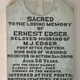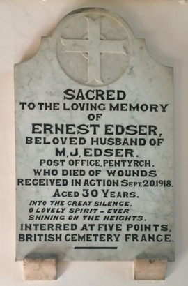 Sacred to the loving memory of Ernest Edser beloved husband of M J Edser Post Office Pentyrch who died of wounds received in action Sept 20.1918 aged 30 years Into the great silence O lovely spirit - ever shining in the heights Interred at five points, British Cemetery France