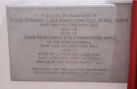 IN LOVING REMEMBRANCE OF / DAVID EDMUND COLE-HAMILTON, D.S.C. ROYAL NAVY / WHO DIED ON JUNE 14TH 1942 / AGED 28. / ALSO OF / JOAN MARGARET COLE-HAMILTON, M.B.E / OF THE FOREIGN OFFICE / WHO DIED ON JULY 4TH 1945 / AGED 27. / BOTH OF LLANGATTOCK RECTORY. / THEY GAVE THEIR LOVES ON ACTIVE / SERVICE IN THE SECOND WORLD WAR. / THIS TABLET AND THE ADJOINING ALTAR RAILS / WERE GIVEN BY THEIR FAMILY AND FRIENDS.