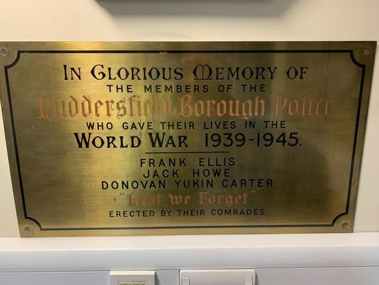 IN GLORIOUS MEMORY OF/ THE MEMBERS OF THE/ Huddersfield Borough Police,/ WHO GAVE THEIR LIVES IN THE/ WORLD WAR 1939 - 1945./ (NAMES)/ "Lest we Forget"/ ERECTED BY THEIR COMRADES.
