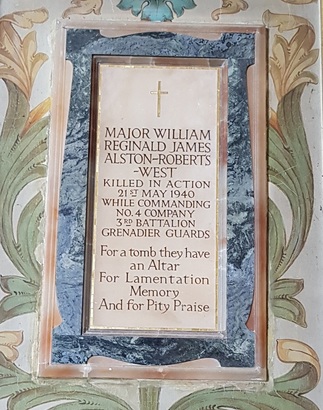 For a Tomb they have an Altar, For Lamentation Memory, And for Pity Praise In memory of Maj William Reginald James Alston-Roberts-West, Killed in Action 21st May 1940 while Commanding No 4 Company, 3rd Battalion Grenadier Guards