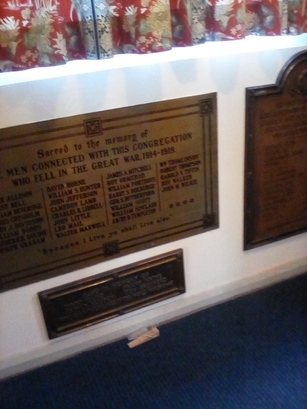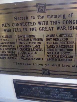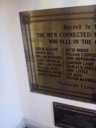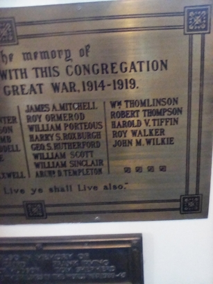 SACRED TO THE MEMORY OF/ THE MEN CONNECTED WITH THIS CONGREGATION/ WHO FELL IN THE GREAT WAR, 1914 - 1919./ (names)/ BECAUSE I LIVE YE SHALL LIVE ALSO