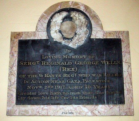 In loving memory of Sergt Reginald George Wells (Rex) of the 1/8 Hants Regt who was killed in action new Gaza. Palestine. Novr 2nd 1917, aged 30 years. Greater love hath no man than this that he lay down his life for his friends.