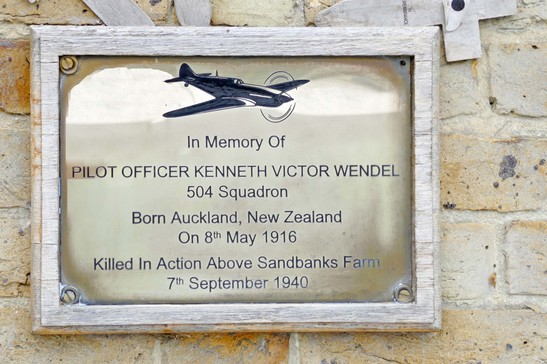IN MEMORY OF / PILOT OFFICER KENNETH VICTOR WENDELL / 504 SQUADRON / BORN AUCKLAND, NEW ZEALAND / ON 8TH MAY1916 / KILLED IN ACTION ABOVE SANDBANKS FARM / 7TH SEPTEMBER 1940