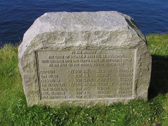 TO THE MEMORY OF / THE CREW OF HALIFAX R 9438 (H), 35 SQUADRON, / WHO CRASHED INTO THE CLIFFS HERE ON RETURNING FROM / AN AIR RAID ON THE TIRPITZ, 30/31st MARCH 1942: / (7 names, with rank, crew position and service number)